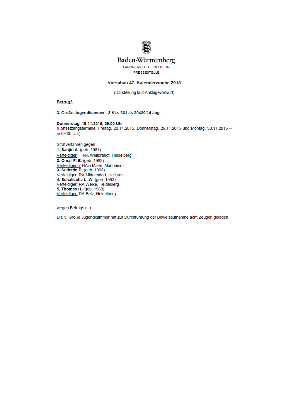 Landgericht Heidelberg: Verfahren gegen fünf mutmaßliche Betrüger startet vor Jugendstrafkammer